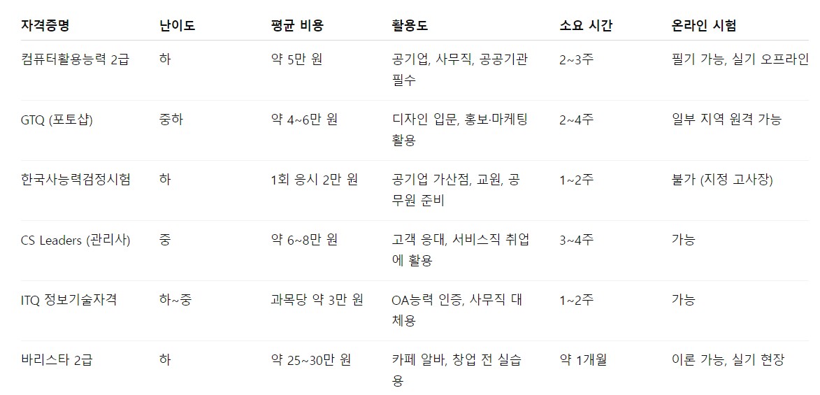 2025년 기준으로 1개월 이내 취득 가능한 실속형 자격증 10가지, 각 자격증의 실전 정보도 함께요.